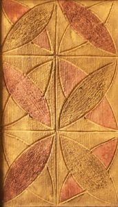I cut these low-relief directly into wet mud smeared on sheetrock panels. After they are finished (and dry), I apply colored washes, which also make the surface more durable. Click on the thumbnail to see the entire image, uncropped. They range in size from about 16 x 24 inches to the big mural, which is about 8 x 20 feet. All were part of an installation/show at the Bush Barn Gallery in Salem, OR, in 2004. Note the wall made of temporary gallery wall panels that we assembled into a gateway, covered with cardboard, and then plastered with mud. The finger pattern was copied directly from a . . .