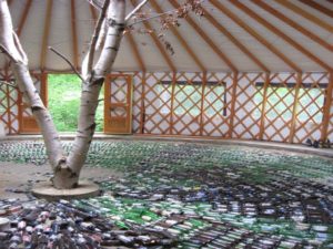 Rusty Orner, of Quiet Creek Farm, in PA, took the idea of insulating an oven floor with recycled beer bottles and applied it to a yurt he was building as a classroom and bunk space for students and interns. On leveled ground, they made a rubble trench, covered with gravel bags and capped with mortar and slate, to support the lattice walls of the yurt. They filled the thirty foot diameter donut with packed shale, a thin layer of sand, and then 5,000 beer bottles. The empty bottles provide four inches of insulation and a thermal break to keep cold from migrating into the floor. Rusty . . .