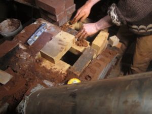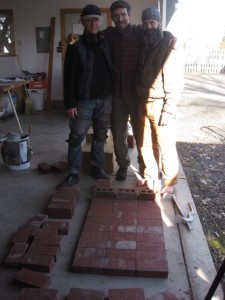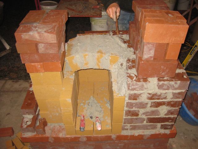 hand made arch: lasse’s quick formless technique requires one person holds the bricks in place while others fill the spaces w/chips and mortar