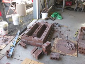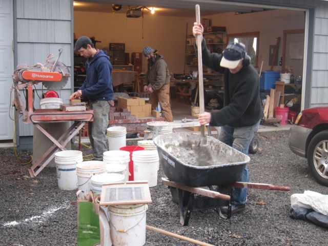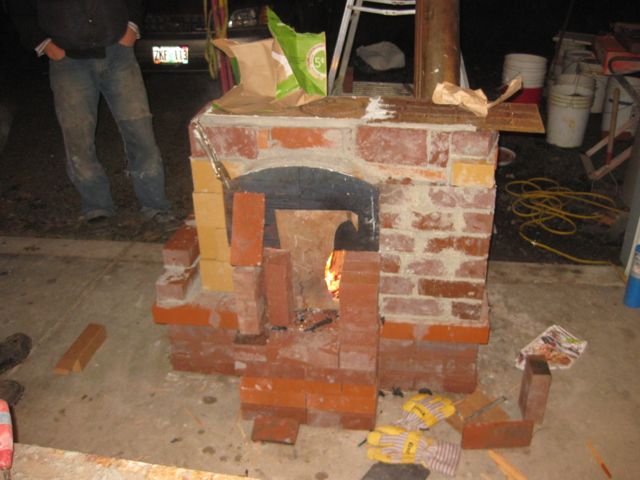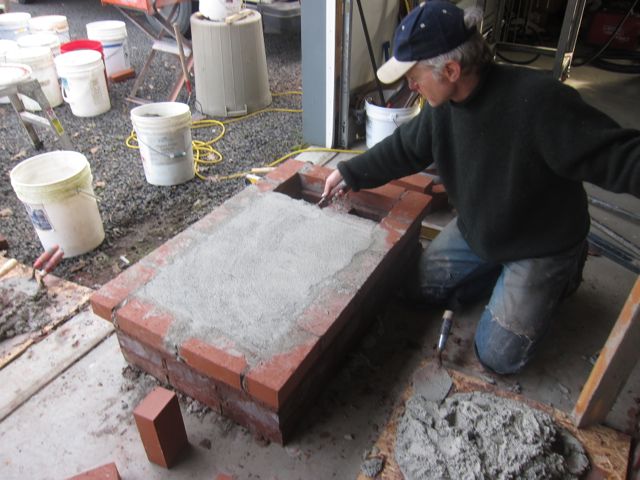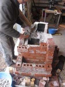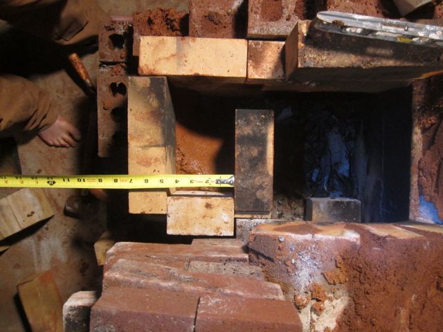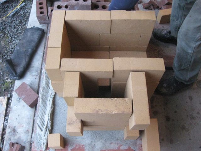 This photo-essay documents about 2 days of experimentation that resulted in a pretty stupendous new variation on Max’s “Cabin Stove.” The overall footprint of the stove determined the firebox size, and the geometry resulted in a rectangular heat riser that took hot gasses from a vertical throat in the corner of the firebox — unconventional, but it worked amazingly well. More to come! (Ed. Note: This stove, like so many others, is merely one more in a long line of innovations and adaptations, all based on the same basic principles: burn the fuel fast, hot, & clean, and extract and store as much heat as possible prior to venting. Within this long tradition, however, valuable technical analysis and development has recently been offered by a Danish builder named Peter Vandenberg. His contribution have provided inspiration and guidance for understanding and improving the hows and whys of clean combustion. Peter offers comments at the end of the post, and is a regular contributor (along with Lasse Holmes) to an online stove forum at http://donkey32.proboards.com/.