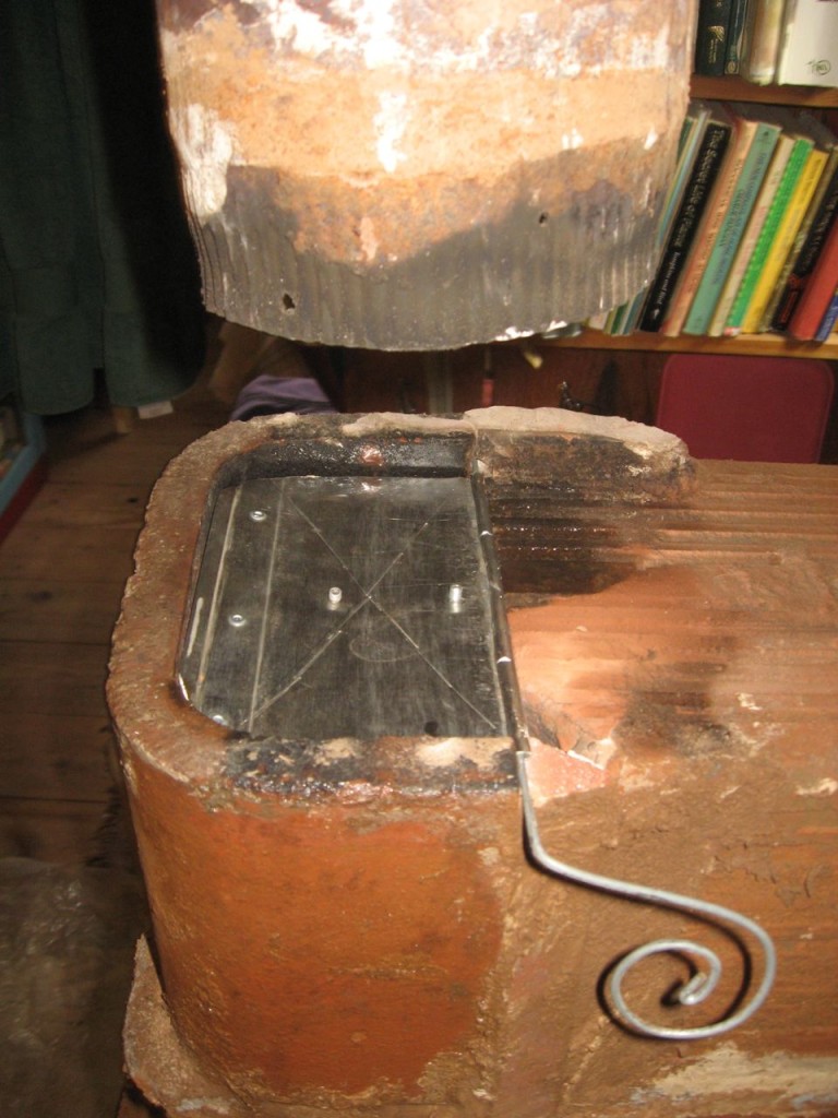 I was reluctant to publish formal plans or how-to info as I consider this to be an experimental prototype, but rocket goddess (and Sketchup artist) Erica Wisner was inspired to draw up some basic plans, and convinced me that they should be available for other experimenters. So, if you’re inspired to work on increasing wood-stove efficiency, please do download the drawings (free! through the bookstore) — but note that there are important detail photos at the bottom of this post which will clarify some important points that aren’t covered in the plans). I’ve also been answering questions in the replies below the post, so read through those, too. And take good care! That means build and test your design somewhere outside before you do your final installation! Also design and build-in a better clean-out, and please do send me news and photos so others benefit from your experience!