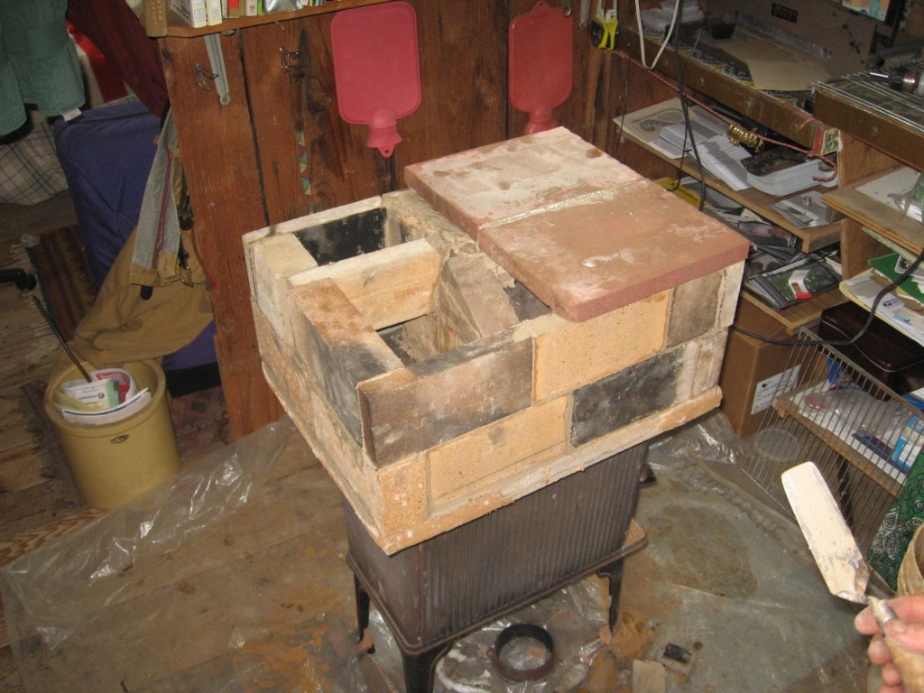 The videos below show (roughly) how it goes together. The (free) plans are available thru the bookstore (link below). In addition, I’d recommend you to the Masonry Heater Association, and Alex Chernow’s website. Alex has been developing bell stove designs, and has links to a Russian heater builder who makes brilliant sense of the theory, which is really just flow — think funnels full of water, then turn ’em upside down and re-envision the water as hot gases. Everything goes from there.