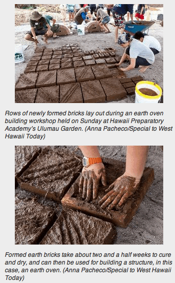 “These bricks, stacked and left to dry for about 2.5 weeks, are the start of a future earth oven at the campus’ Ulumau School Garden. The oven will be used by HPA (Hawaii Preparatory Academy) students, staff and their ohana to bake breads and pizzas, as well as to cook vegetables grown on site, said Koh Ming Wei, HPA’s sustainability curriculum facilitator.”