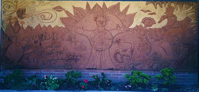 The greatest opportunity of such murals, however, poses challenges and rewards much greater than “teaching religion.” By far the greatest success would be to transplant the arts into the perennial culture of the school by making of them an annual rite, like the Basutho renewal of their house murals. Many schools make a rite of annual sports events or annual class trips or (in Oregon, at least) what they call “outdoor school,” whereby a whole class takes a week at the end of the year to go camping. By making an annual rite of removing and re-making a mural, schools could substantially enrich their local culture. Those who made last year’s mural would train and assist a new team the next year. The entire school could be involved in refining, re-defining, or re-envisioning a theme. Teachers could build enthusiasm and energy for the event by adapting their other curriculae to the shared subject. Students would become teachers, and all would share in developing a local tradition based on real skills and knowledge. And there would be far fewer divisive questions about committing the entire community to one permanent and eternal piece of art because every year would provide a new group the opportunity to tell the same story in their own way. And finally, the matter and spirit of the earth itself would take its rightful place as both source and symbol of eternal renewal. Old mud can be made new simply with the addition of water. Or it can be returned, usefully and joyfully, to the ground out of which it came. Either one would celebrate, beautifully, the same, essential truth.