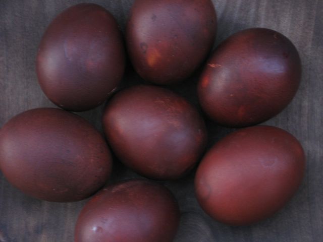 I don’t normally get excited about hard-boiled eggs, but these aren’t your normal fare. The color alone gives them a quality like deeply polished mahogany; the flavor is nutty and sweet; the texture of the white is firmer, while the yolk is softer. The trick is simply to boil them gently with onion skins, overnight, in the declining heat of your oven. Red onion skins give a deeper color — these were cooked with white onion skins.